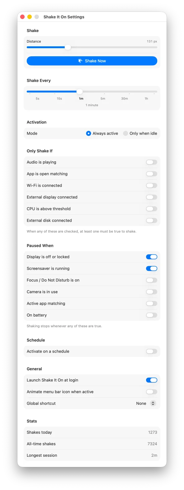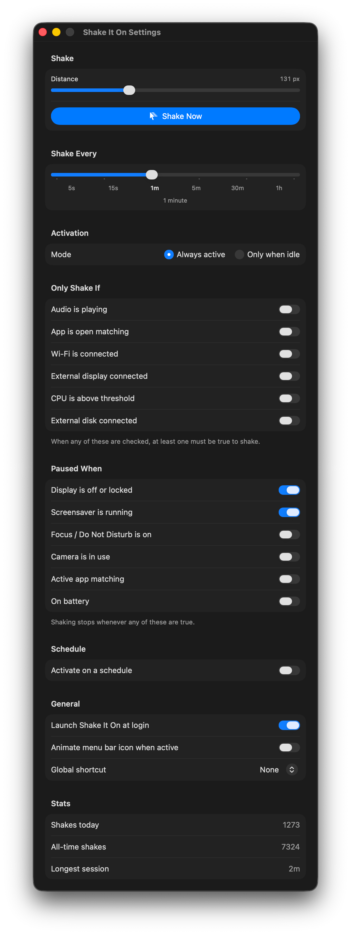 Shake It On is a macOS menu bar utility that prevents your Mac from sleeping by moving the cursor along a natural, layered sine wave. Unlike system-level caffeination tools, Shake It On generates real input events, which means apps that track user presence (Slack, Teams, Zoom, remote-desktop clients) continue to see you as active. Smart conditions let it run only when needed: when audio is playing, when a specific app is running, when CPU is busy, or on a schedule. $9.99 one-time, no subscription, macOS 14 and later.